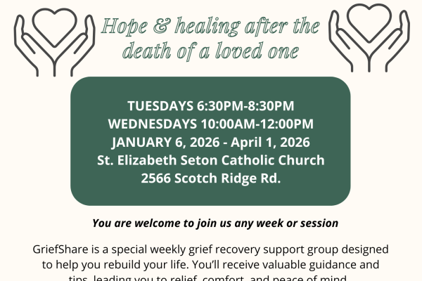 GriefShare is a special weekly grief recovery support group designed to help you rebuild your life. This program will run January 6th through April 1, 2026. Plan to Join us on Tuesday evenings from 6:30pm – 8:30pm at St. Elizabeth Seton Church and Wednesday mornings 10am – 12pm.